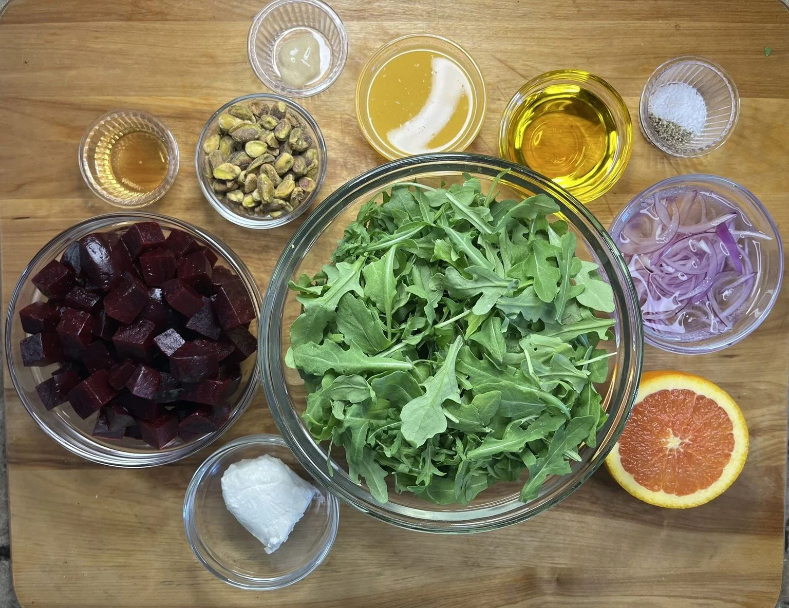 Make the salad by layering the arugula or greens with the red onion, roasted beets, and pistachios. Top with crumbles of goat cheese.